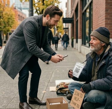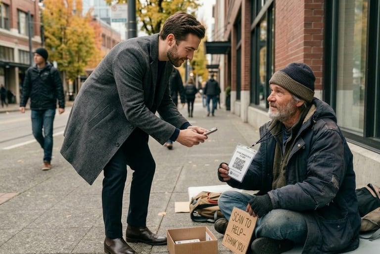 When you see a program participant, simply use your smartphone to scan their unique QR code. This quick action opens a secure donation portal, allowing you to give instantly without needing cash, while offering a meaningful moment of human connection.